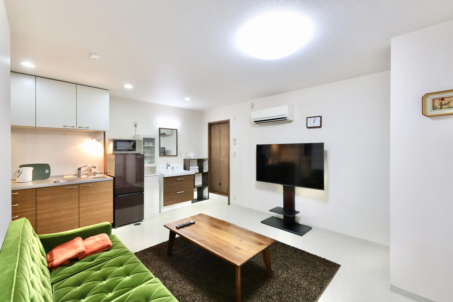 ここは、お友達の家に泊まっているかのような雰囲気で、仲良しグループやファミリーでの団らんにもピッタリのお宿です。大型TVで映画やドラマを観たいだけ、ソファーでゆっくりご覧いただけます。シンプルな造りでリーズナブルなのも魅力です!